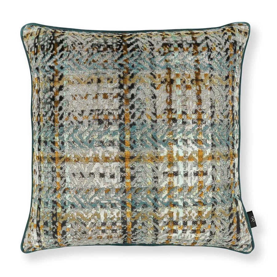 this jacquard velvet is first woven with highlights of metallic threads and printed in rich colour with a statement check design.