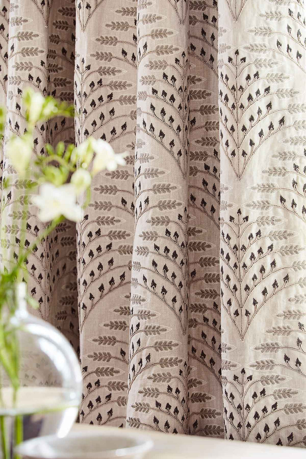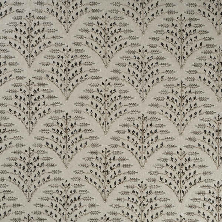 Our embroidery collection is an intricate textural range of stunning designs and this embroidery is an incredible addition. Branches are outlined with corded detail, each one finished with a leaf, all leading to a larger leaf at the tip in a softer tone. It's a design with hints of architectural forms, the branches espaliered as they would climbing a garden trellis. The embroidery is produced using new techniques that create the effect of a hand stitched fabric.