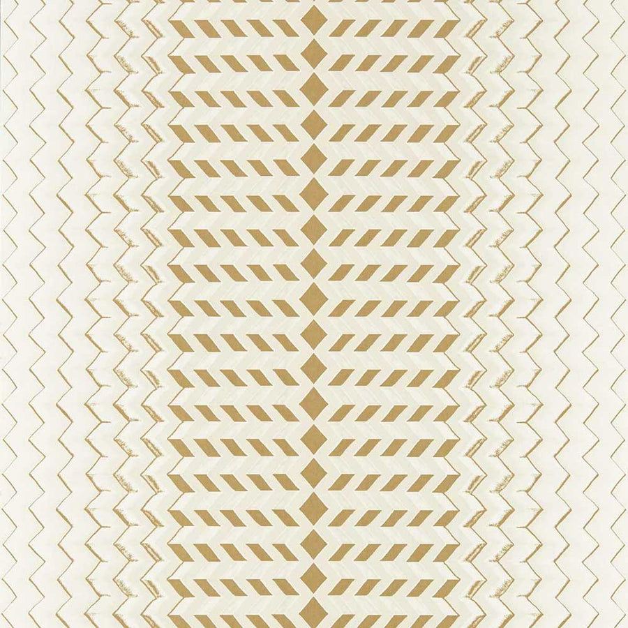 Fragment shows an angular geometric chevron stripe featuring a linear metallic. Gravure printed on 150g non-woven.