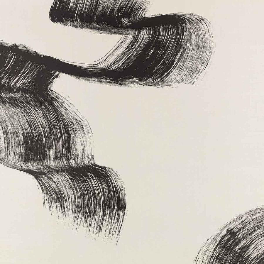 The dramatic brushstrokes appear dynamically across the wall in a grand spectacle, rising with a tactile prominence from the fine, silk-like background.