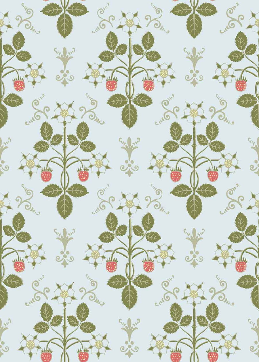 Strawberry’s uniform print is an organic geometric of delicate strawberry fruits and flowers. Originally a hand-block printed design from the 1840s, this design has been reimagined in soft hues, playing to the pastoral elements found throughout.