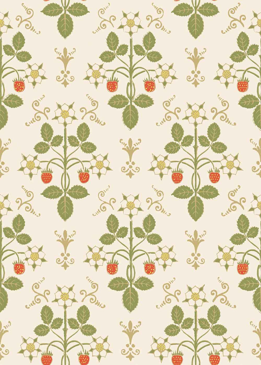 Strawberry’s uniform print is an organic geometric of delicate strawberry fruits and flowers. Originally a hand-block printed design from the 1840s, this design has been reimagined in soft hues, playing to the pastoral elements found throughout.