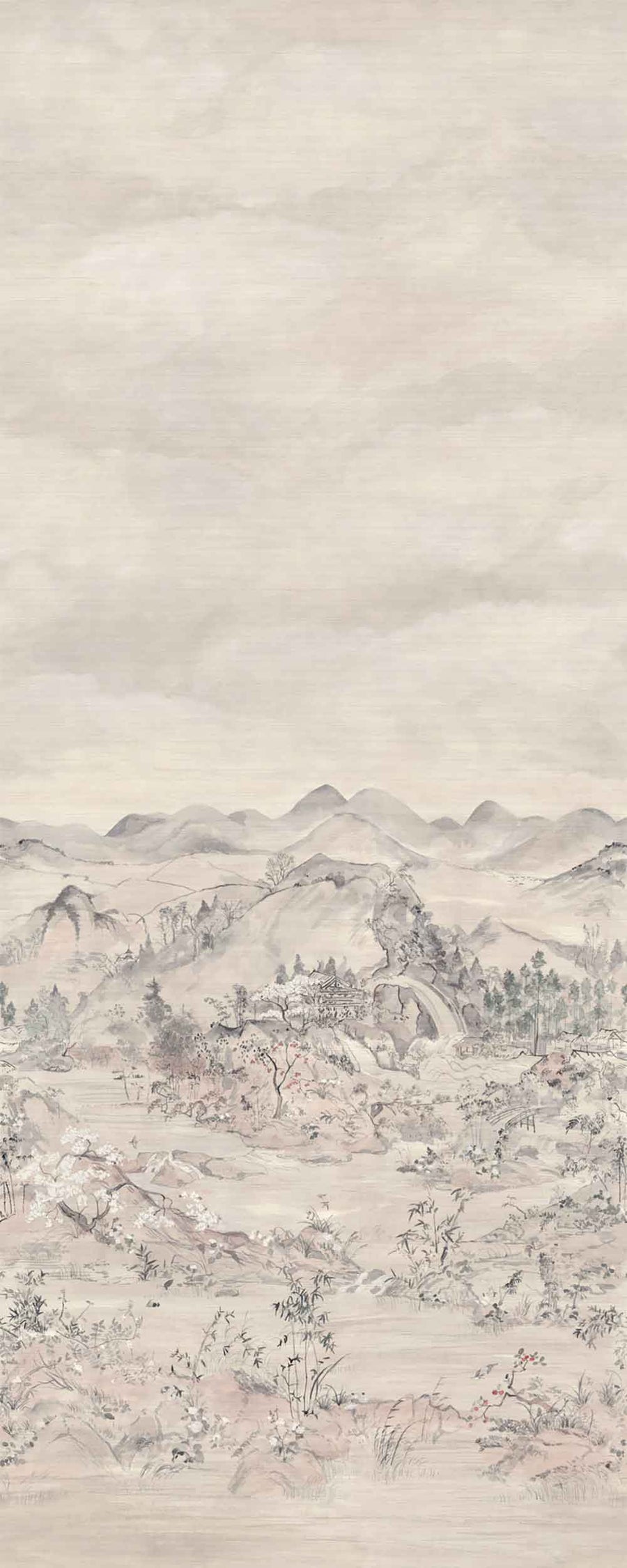 A breathtaking chinoiserie that is a culmination of several sceneries resonating from the most beautiful gardens of Japan. Let the calligraphy strokes guide you through the landscape. Immerse yourself through hills, trees, flowers, and the flowing water that cascades throughout the panel. Experience the charming blossoms of the iconic Sakura tree that poetically and aesthetically bloom in the natural landscape. Japanese Chinoiserie is available in six colourways on traditional bases, as well as one colourway offered on a Natural Grasscloth. The use of natural materials in Japanese culture links back to ancient times, exemplifying the incredible craftsmanship with a ‘stitch by stitch’ methodology. Japanese Chinoiserie is painted in a traditional style, yet it gives a modern and timeless feel.