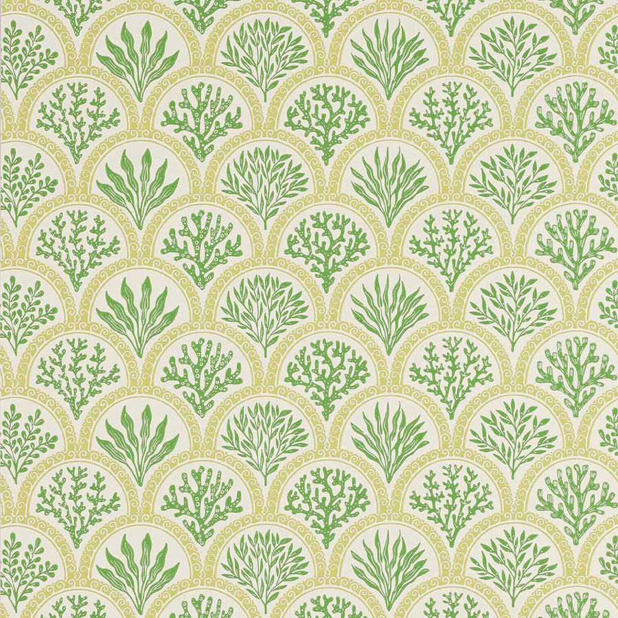 Surface printed to capture the look of a block print, coral motifs are printed within a decorative scallop design in this joyous, distinctive paper. Coloured in bright zappy shades, it is complemented by a printed fabric of the same name.