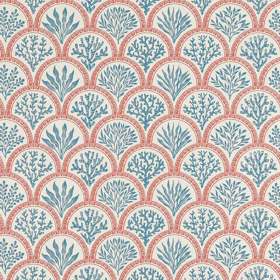 Surface printed to capture the look of a block print, coral motifs are printed within a decorative scallop design in this joyous, distinctive paper. Coloured in bright zappy shades, it is complemented by a printed fabric of the same name.