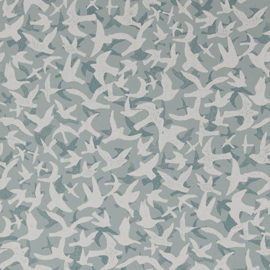A flock of birds wheels across the summer sky in this all over wallpaper. The design has a slightly fifties feel with its even repeat and textural surface printed texture.