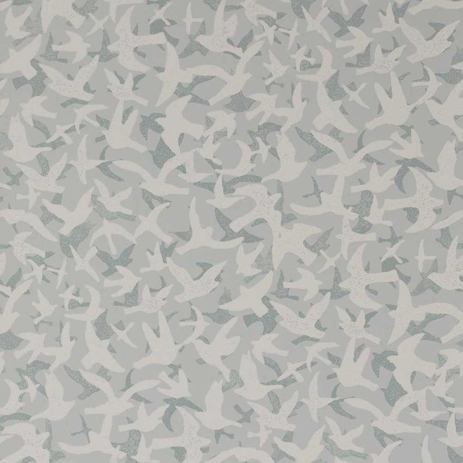 A flock of birds wheels across the summer sky in this all over wallpaper. The design has a slightly fifties feel with its even repeat and textural surface printed texture.