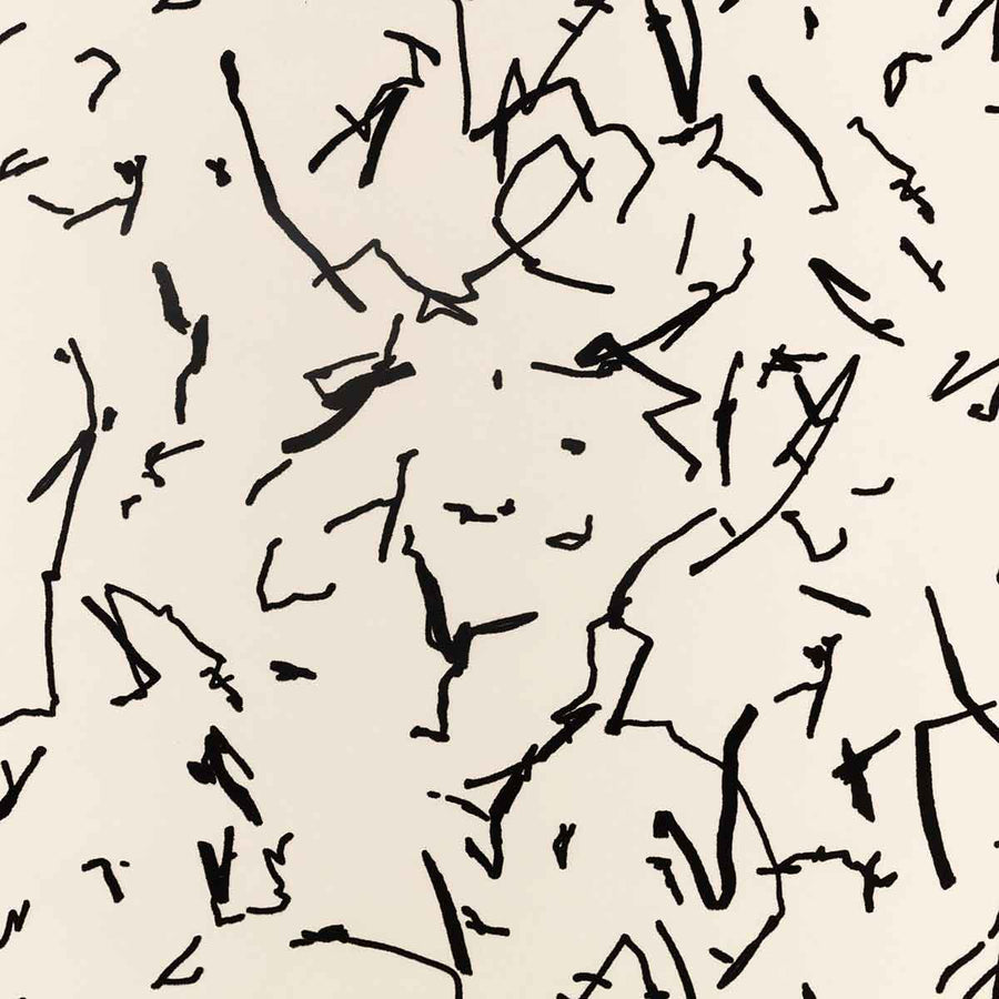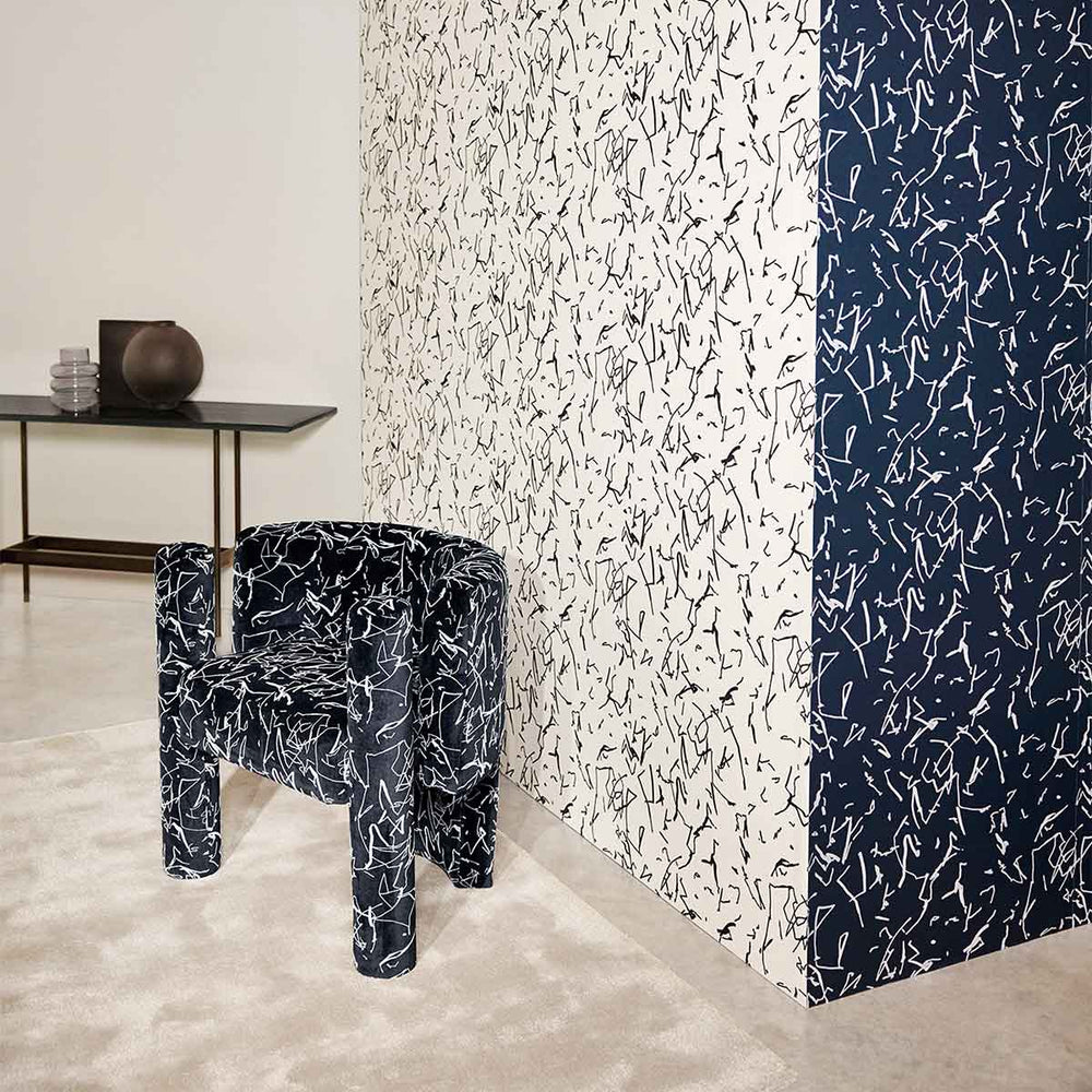 A juxtaposition of texture; velvety, flocked scribbles cover a wood pulp and plant-fibre blended ground. Representing a musical beat, each scribble was originally hand-drawn whilst listening to music, reacting to each note in a different way to form an avant-garde, all-over design.