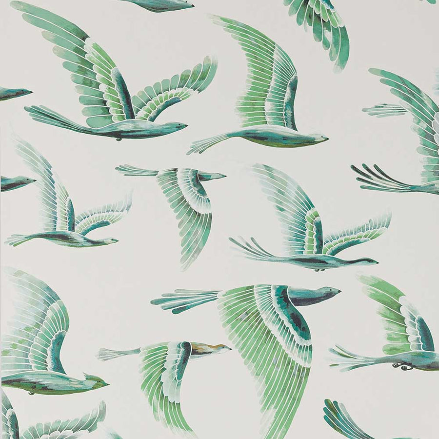This large-scale, stylised depiction of a flight of wild birds brings us between sky and earth in a graceful ballet. Gravure printed to maintain all the transparencies and subtle mixture of tones of the bird’s wings.