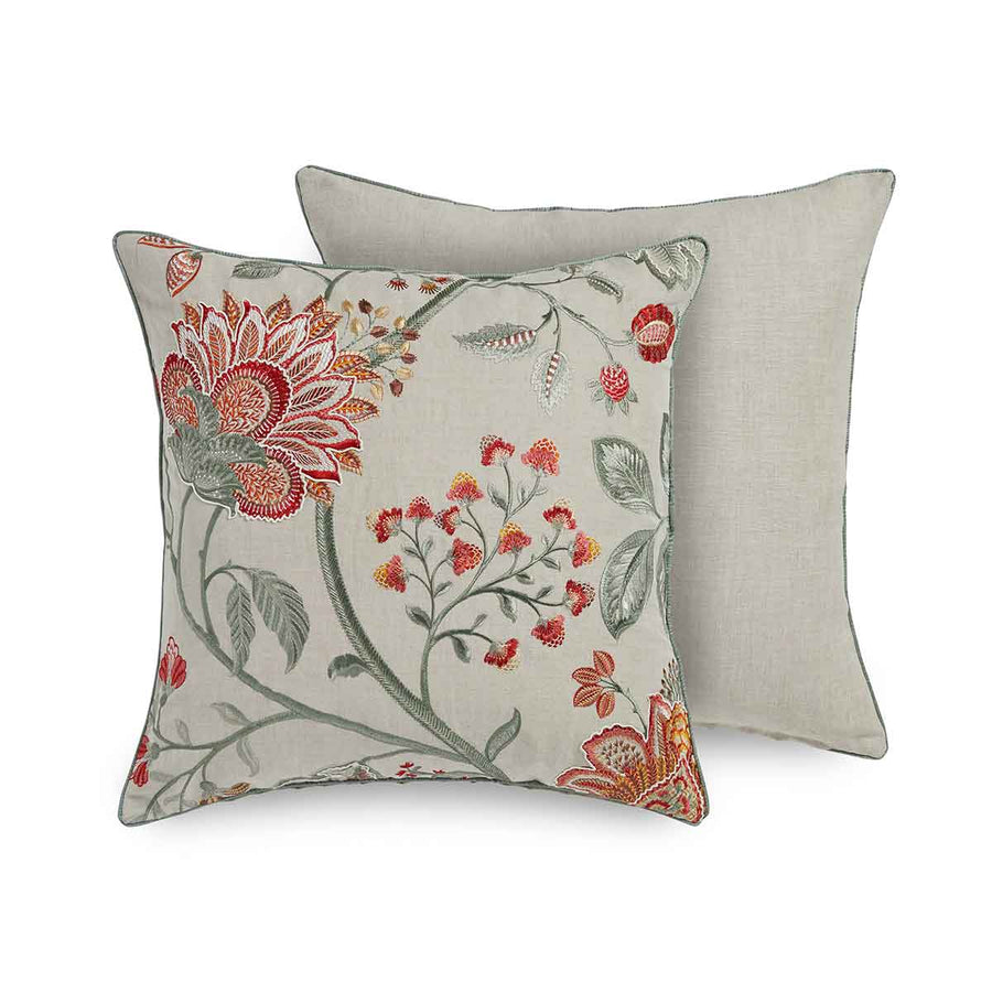 The exquisite Shalimar cushion showcases a breath-taking floral design, brought to life with a palette of ten distinct colours and delicate corded details for added pattern definition. Finished with a discreet concealed zip and a luxurious silk piped edge to complete the opulent look, the Shalimar cushions is a statement embroidery and is the perfect centrepiece for any bed or sofa. Available in 3 colourways. Designed and handmade in England. Pattern placement may vary. Fillers sold separately.