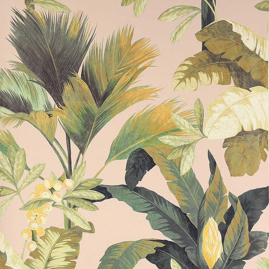 Created in ink wash and pastel, this exotic design transports us into a luxuriant palm grove, a sophisticated large-scale pictorial representation.