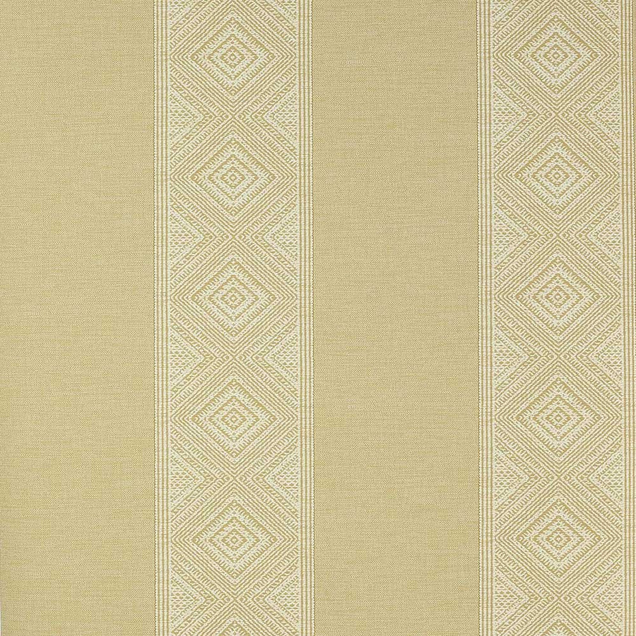 A wallpaper interpretation of the fabric Taya, imitating its texture. This two-tone wallpaper alternates textured stripes with stripes of geometric detailing.