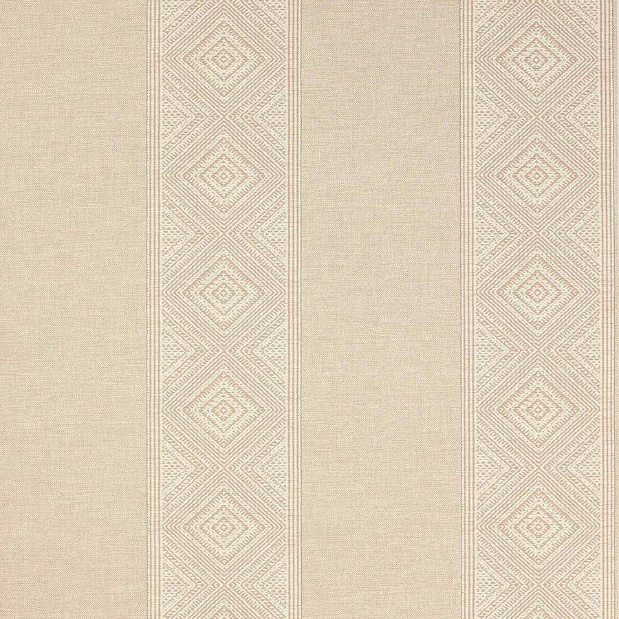 A wallpaper interpretation of the fabric Taya, imitating its texture. This two-tone wallpaper alternates textured stripes with stripes of geometric detailing.