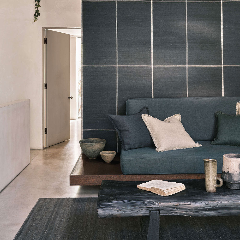 A large-scale check is picked out using raffia against a ground of handspun cotton in this strikingly elegant handwoven design.